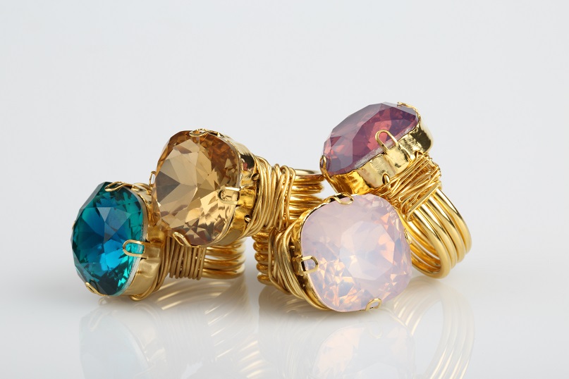 Si bien “Géminis” es una colección que está compuesta por yuntas, zarcillos, pulseras, collares y anillos elaborados en bronce o cobre con cristales o piedras semi preciosas (facetadas o cabuchón), con baños de oro 24k o plata 925; hay que destacar que de manera paralela, Silvia Olavarría también aprovechó este lanzamiento para presentar otra entrega mucho más sutil y sencilla a la cual tituló “Wire” (guayas), ya que las piezas fueron elaboradas precisamente a partir de guayas de alambres de plata, bronce y cobre, que posteriormente se bañaron también en oro 24k.