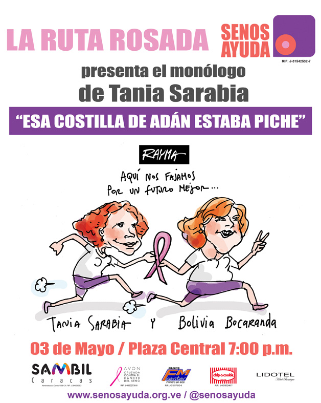 SenosAyuda arrancará su plan por el 2012, en la Plaza Central de Sambil Caracas el jueves 3 de Mayo, llevando su importante mensaje “El ABC del Cáncer de Mama” a cargo de la Coordinación de Educación de SenosAyuda. En horas de la tarde, 7:00 p.m. en el mismo lugar, Plaza Central, Nivel Autopista del Centro Sambil de la Capital, la primera actriz Tania Sarabia cerrará con broche de oro el día con la presentación en tarima de la obra “Esa Costilla de Adán Estaba Piche”.