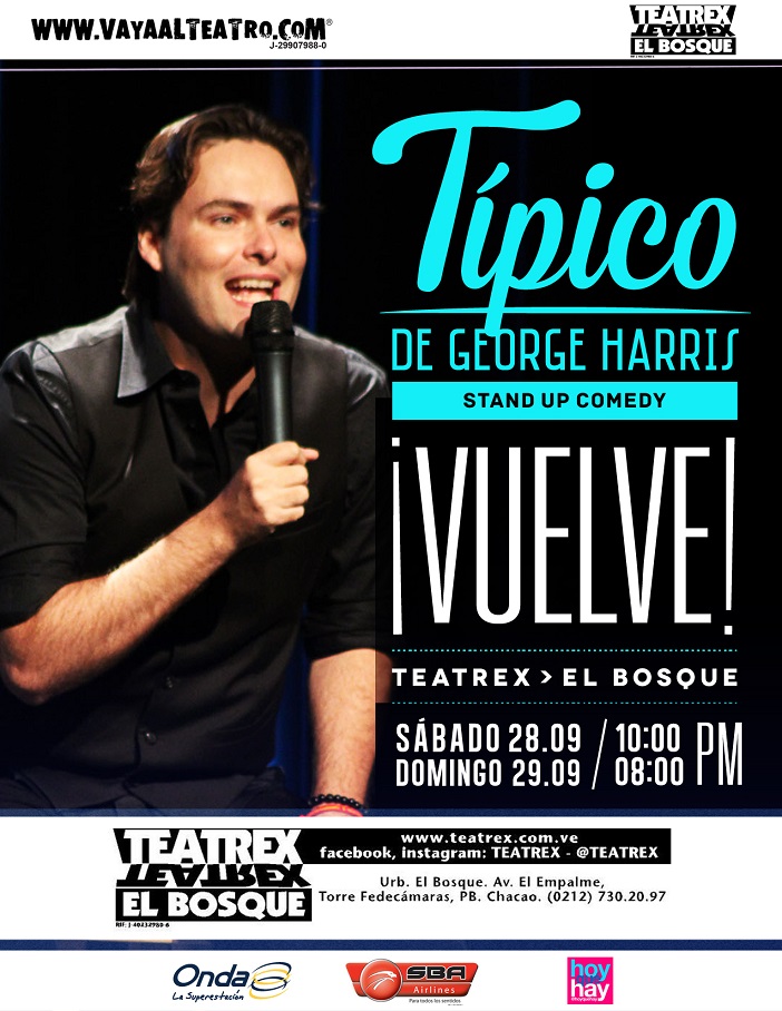 Típico es el nombre del más reciente stand up comedy de George Harris que se presentará este fin de semana en segunda temporada. Después de vivir 2 años en Miami y poder ver la mezcla tan salvaje de nacionalidades que hay en esa ciudad, comienzan las comparaciones. Así como las observaciones de lo que le cuesta a los latinos adaptarse a este país: Las reglas, los impuestos, la barrera del idioma, de costumbres, la soledad, el crédito… En fin, la adaptación de nuestra cultura latina a este mundo.