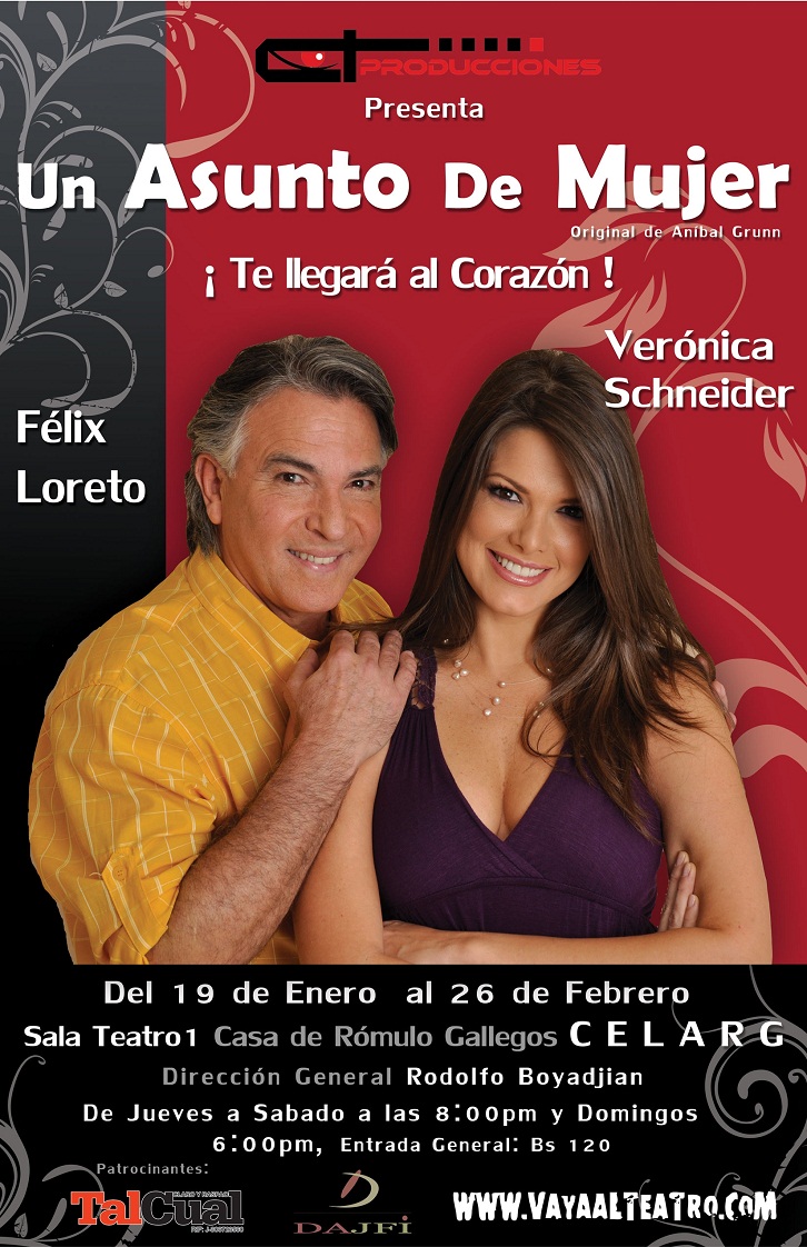 Son sólo dos personajes, y quienes han podido ver algún ensayo aseguran que entre Verónica Schneider y Félix Loreto se sacan chispas en el escenario, tal es la intensidad de las escenas. Nadie será ajeno a la trama que plantea la obra, pero los responsables del montaje aseguran que tal vez sea ésta la única obra en mucho tiempo en la que la mujer no habla mal de los hombres ni el hombre de la mujer. Es una fascinante obra en la que tanto el hombre como la mujer entienden que son el uno complemento de la otra, que se necesitan…y que sólo en pareja y con amor la vida tiene sentido…Funciones de jueves a sábado a las 8.00 p.m. y domingos a las 6:00 pm. en la sala UNO del CELARG, Av. Luis Roche de Altamira. Estacionamiento.