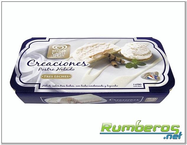 – Creaciones Tres Leches: bizcocho relleno de cremoso y suave helado con sabor a tres leches con un rico sirop de leche condensada en el tope.
