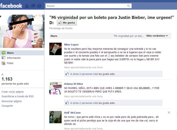 Todo se habría llevado a cabo a través del grupo de Facebook «Mi virginidad por un boleto para Justin Bieber, ¡me urgeeee!» Las críticas por parte de los usuarios de la red no se han hecho esperar con insultos y desaprobación hacia la adolescente.