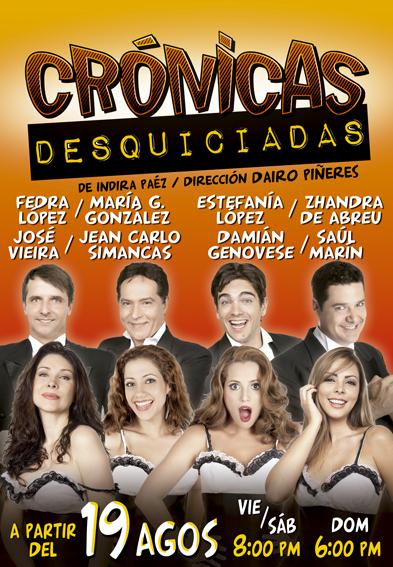 Humor “inteligente”, “mordaz”, “vibrante” han sido solo unos de los tantos calificativos que han descrito esta maravillosa pieza original de nuestra venezolana Indira Páez y acreedora del Premio Municipal de Teatro 2002. Cargada de una verdad dramática que traspasa fronteras, de un sarcasmo delicioso acerca de temas tan universales como el amor, el desamor, la supervivencia, la incomunicación y las relaciones de pareja, el Grupo Teatral Séptimo Piso bajo la dirección de Dairo Piñeres trae a la escena caraqueña la pieza “Crónicas Desquiciadas”. Las primeras figuras Jean Carlos Simancas, Fedra López, Saul Marín, Estefanía López, Zhandra De Abreu, José Vieira, Damián Genovese y María Gabriela González conforman el elenco que dará vida a estas historias cargadas de delirante realidad. La cita es a partir de este 19 de agosto en el Teatro Escena 8. (Av. La Guairita con Av. Hípica, Las Mercedes). Funciones: viernes y sábados a las 8:00 pm y domingos a las 6:00 pm. Entradas Bs 140,00 a la venta en www.ticketmundo.com, en las taquillas del teatro. Mayor información Telf: (212) 993.44.60 / 56.84 / 48.90) y twitter @dairos