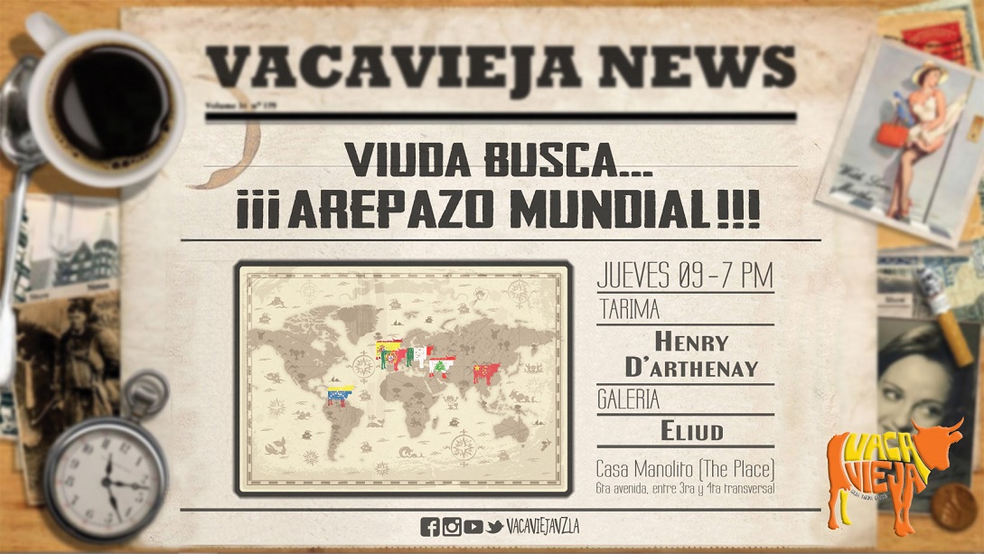 Este jueves 9 de mayo, luego de lograr casa llena en su episodio inaugural, Vaca Vieja (cocina + tarima + galería) invita a todos los que deseen conocer o disfrutar nuevamente de su particular visión gastronómica inspirada en Venezuela, así como de su variada propuesta cultural, a asistir a su segundo episodio Viuda Busca…arepazo mundial que, en esta oportunidad, deleitará con el siguiente itinerario:
