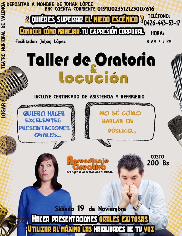 La cita es en el Teatro Municipal de Valencia el sábado 19 de noviembre a partir de las 8:00 a.m. hasta la 5:00 p.m. El taller incluye certificado y refrigerios. La inversión es de 200 Bs. que deben ser depositados en la cuenta corriente BNC 0191 0023 51 2123007616 a nombre de Johan López.
