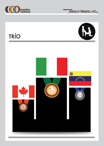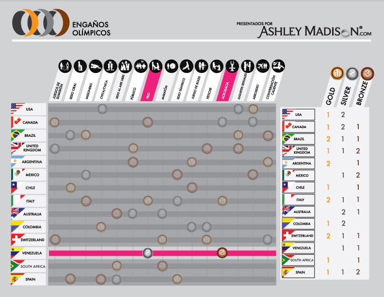 En las Olimpiadas del Engaño de AshleyMadison.com, sitio Web líder en aventuras discretas para gente casada o en pareja, ha repartido medallas a los mejores amantes de los países participantes en 15 categorías diferentes. Los equipos nacionales de los siguientes países se unieron para cumplir con el lema olímpico de Citius, Altius, Fortius (más rápido, más alto y más fuerte): Canadá, Estados Unidos, Gran Bretaña. Sudáfrica, Suiza, Italia, Australia, Brasil, México, Chile, Argentina, Colombia, España y Venezuela.