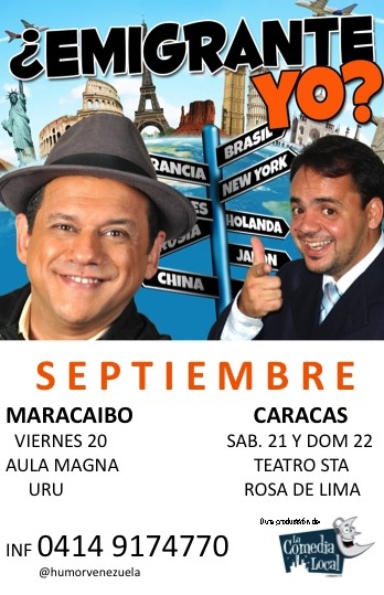 Ante la situación que desde hace ya un tiempo vive el país, algunos venezolanos deciden irse a “probar en otras tierras” “buscar una mejor vida” o encontrar “el sueño americano”. No es extraño escuchar eso de algún familiar, amigo o conocido y de eso se trata el show ¿EMIGRANTE YO? Muchos deciden hacerle frente a las inclemencias y seguir luchando por el futuro del país, pero para los que se van o están pensando en hacerlo, aquí van estas interrogantes: ¿Nos vemos en otro país? ¿Con otras costumbres? ¿trabajando de mesoneros siendo profesionales?. Una carga de energía positiva a través del humor contagiante de estos dos grandes venezolanos es lo que disfrutará el público de EMILIO LOVERA Y AMILCAR RIVERO y solamente tendrán la oportunidad de disfrutarlos. Del 20 al 22 de septiembre de 2013 en Maracaibo y Caracas