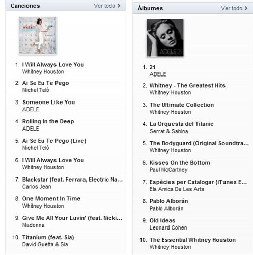 En la categoría de álbumes, la desparecida Houston ha escalado aún más puestos. Actualmente cuenta con cuatro álbumes en el Top 10 de los discos más descargados. The Greates Hists, The Ultimate Collection, The Bodyguard y The Essential Whitney Houston ocupan la segunda, tercera, quinta y décima posición, respectivamente.