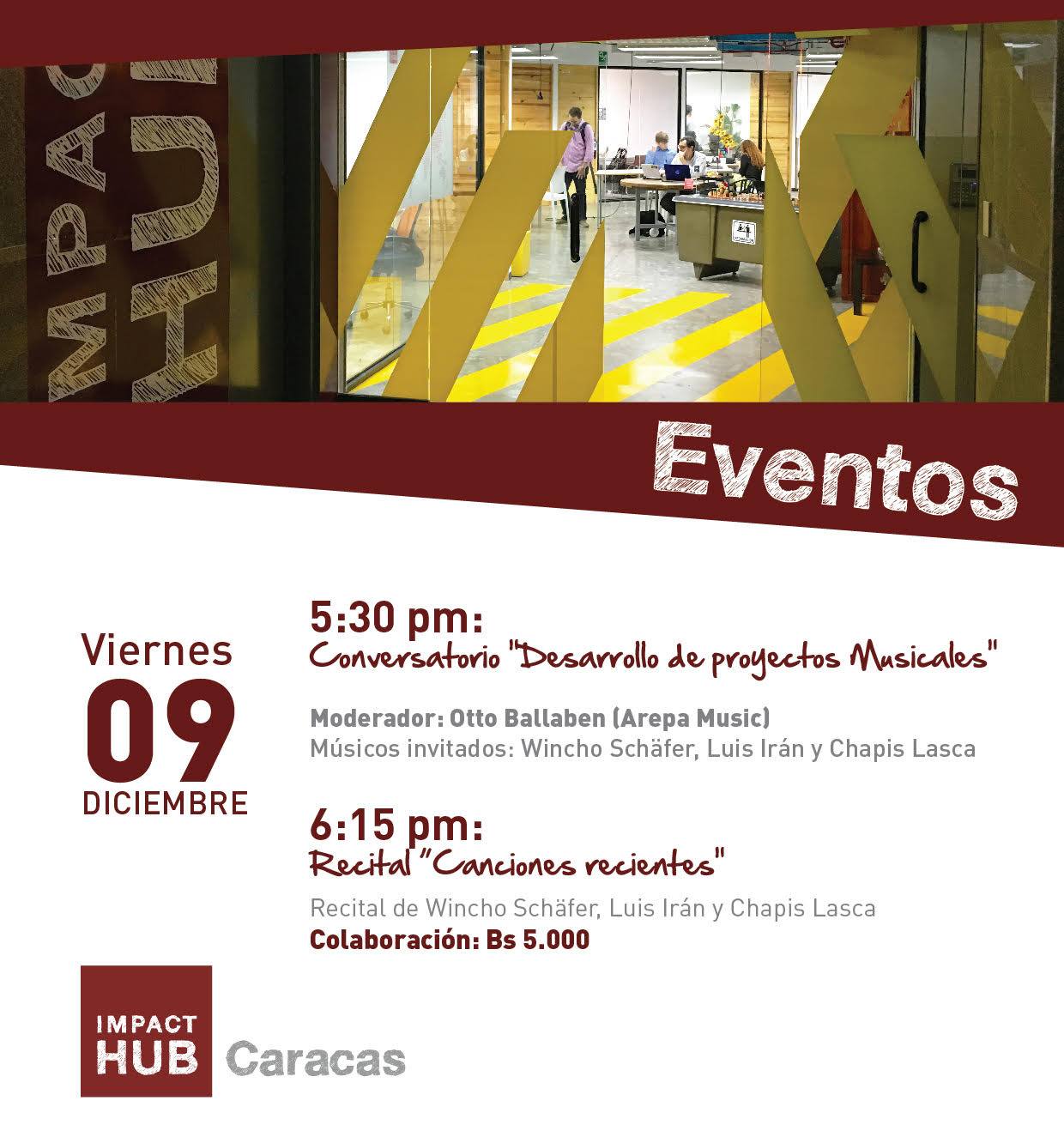 Bajo esta premisa, Impact Hub CCS ofrecerá, este viernes 09 de diciembre, un conversatorio titulado Desarrollo de Proyectos Musicales donde reunirá a Wincho Schäfer, Luis Irán y Chapis Lasca, tres destacados músicos venezolanos,  a hilar ideas sobre este tema basados en la experiencia propia. El conversatorio será moderado por Otto Ballaben y comenzará a las 5:30 de la tarde. Más tarde, a las 6:15, ofrecerán un concierto íntimo al que llamaron Canciones Recientes donde el público se deleitará con las  producciones discográficas que cada uno acaba de publicar: Amor de Madre de Wincho, Cero de Lasca y La Metamorfosis de Luis Irán .