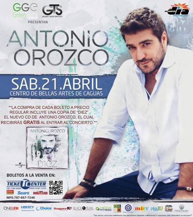San Juan, Puerto Rico – ¡La cita será en abril! El tan esperado concierto del cantautor español Antonio Orozco será el sábado 21 de abril en el Centro de Bellas Artes de Caguas y la venta de boletos  comenzó esta semana a través de Ticket Center. La presentación del mimado de Puerto Rico será toda una experiencia musical puesto que la compra del boleto incluye una copia de su nueva producción discográfica, titulada Diez, la cual recibirán al entrar al concierto.